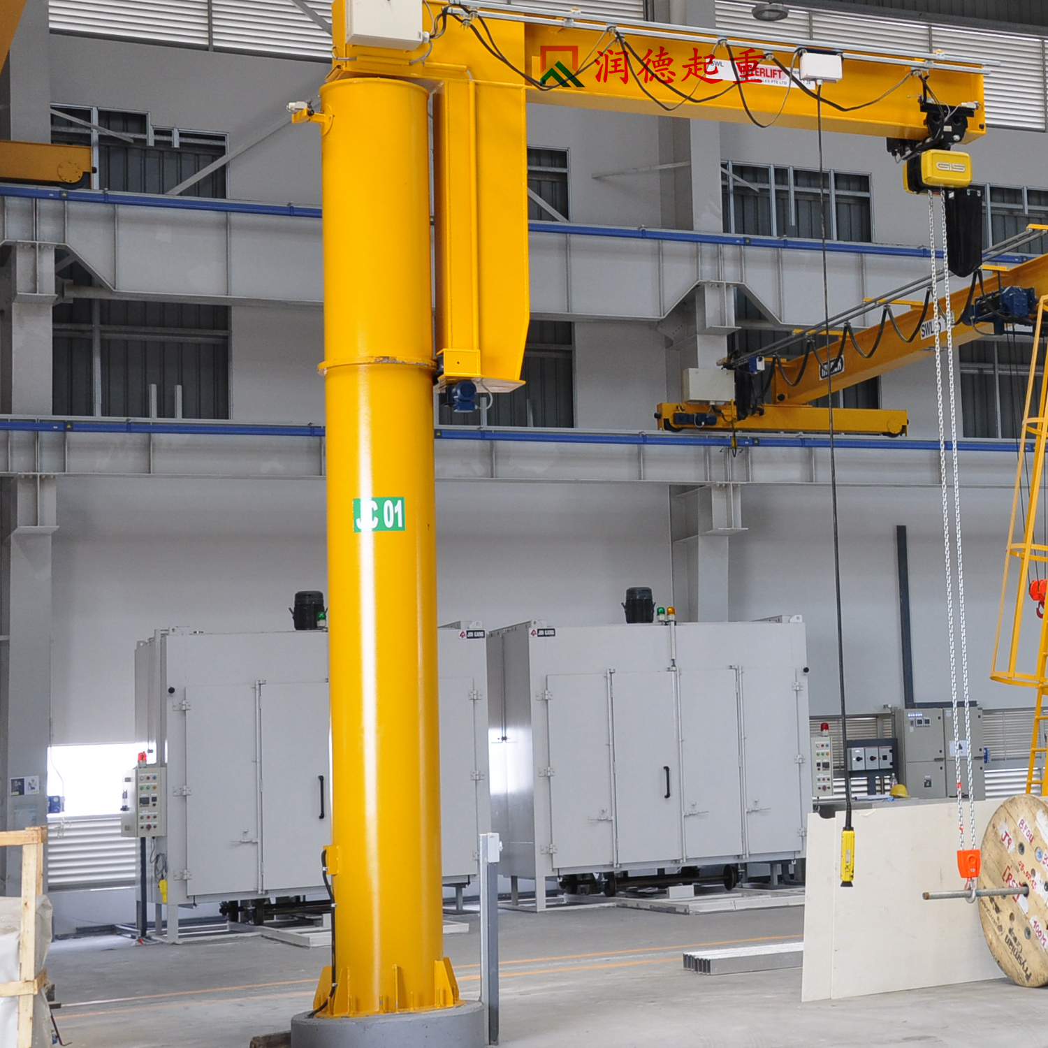 定柱式旋臂起重机配合了可靠性高的JPKK型环链电动葫芦尤其适用于短距离,使用频繁,密集性吊运作业,具有高效、节能、省事、占地面积小,易于操作与维修等特点。环链电动葫芦有起升和在横梁上往返运行的功能,旋臂梁可由回转装置上的的减速机带动滚轮进行回转运动,电器控制箱安装在环链葫芦上。