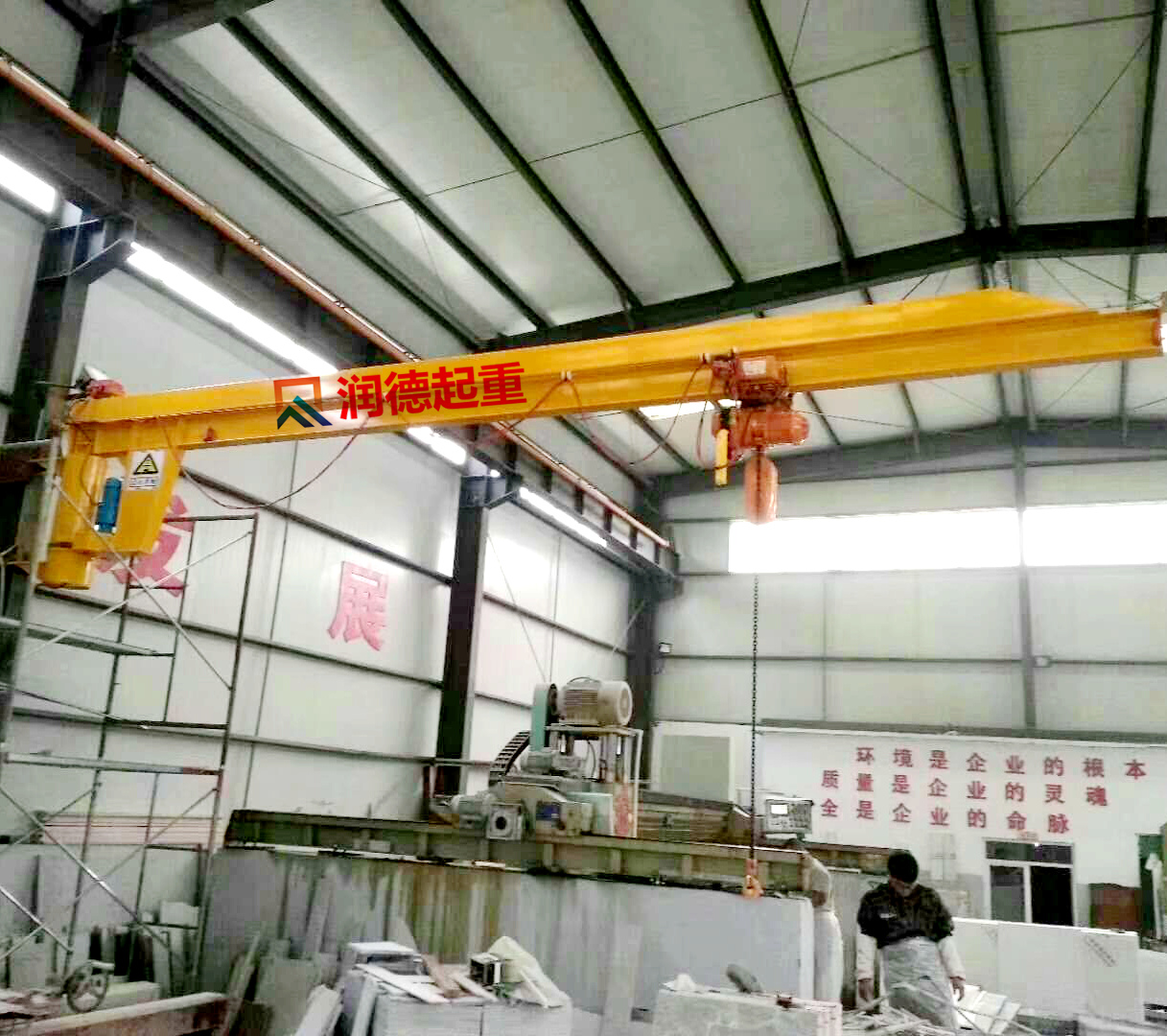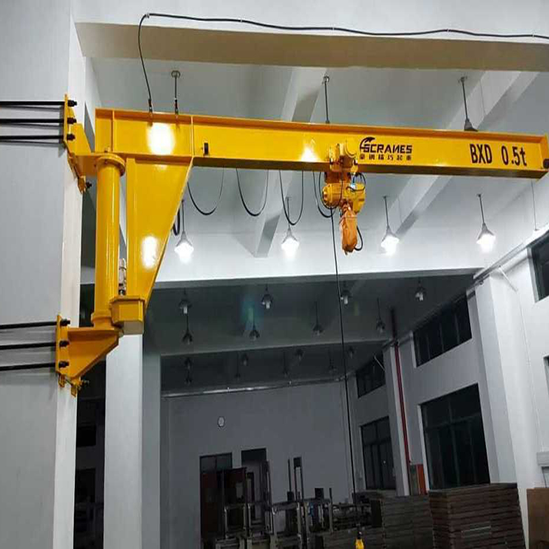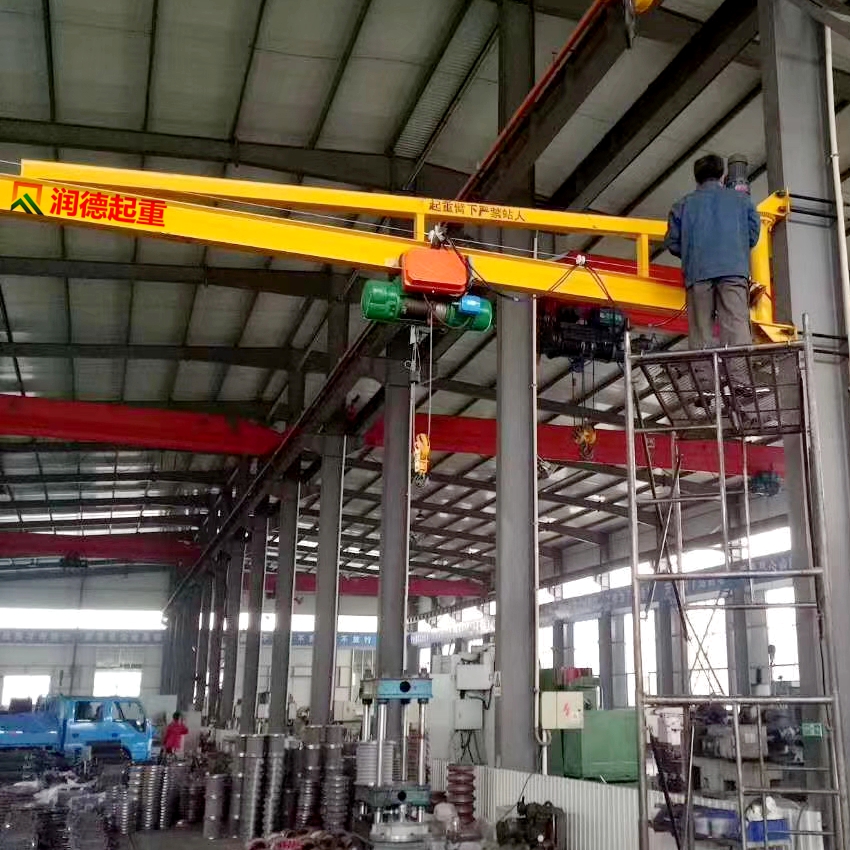 墙壁式旋臂起重机(墙壁吊)由支架、旋臂装置及环链电动葫芦等组成。悬臂固定在墙壁或水泥柱上,可根据用户需求进行回转。回转部分分为手动回转和电动回转。环链电动葫芦安装在悬臂轨道上,用于起吊重物。
