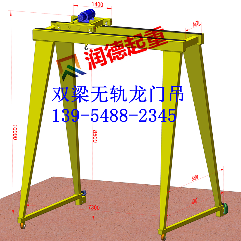 本电动葫芦门式起重机主要由主梁、支腿和下横梁组成,其中主梁和下横梁由四块钢板焊接而成的箱形结构,支腿也是由厚壁矩形管结构组成;电动葫芦直接行走在主梁的工字钢下翼缘板下,为了贮存运输方便,主梁、支腿和下横梁之间用M20螺栓连接成为一体。