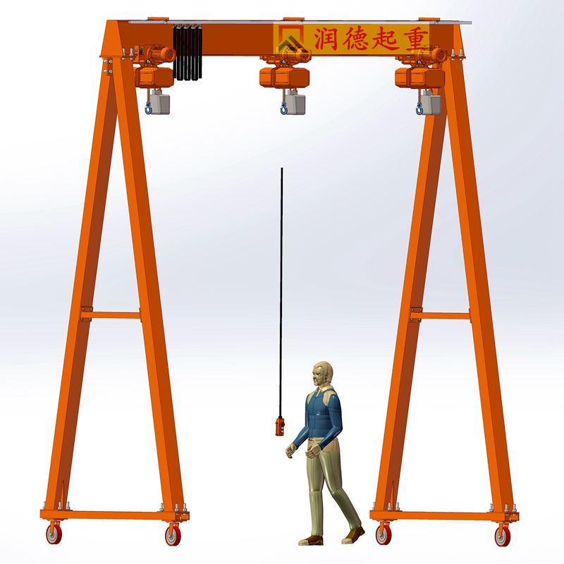 本电动葫芦门式起重机主要由主梁、支腿和下横梁组成,其中主梁和下横梁由四块钢板焊接而成的箱形结构,支腿也是由厚壁矩形管结构组成;电动葫芦直接行走在主梁的工字钢下翼缘板下,为了贮存运输方便,主梁、支腿和下横梁之间用M20螺栓连接成为一体。