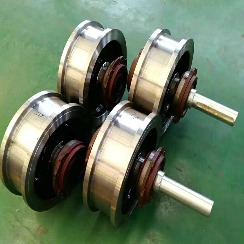 车轮组结构:应用中控制运行机构车轮水平偏斜值主要是根据不同的产品结构采取相应的技术措施。比较常用、工艺措施也相对简单的设计结构是:将车轮装配到支架上组成车轮组,例如角型轴承箱车轮组和台车式45°剖分轴承箱车轮组,在起重机主结构上,安装调整车轮水平偏斜合适后固定。车轮组主要适用于QD5~100T电动双梁桥式、门式起重机,车轮组涵盖Ф250—Ф900等规格,