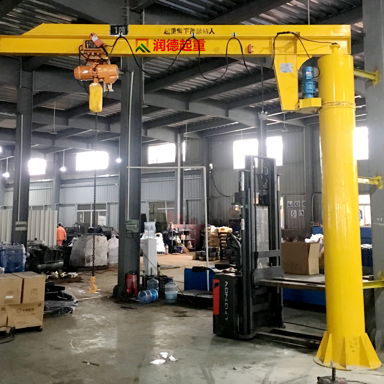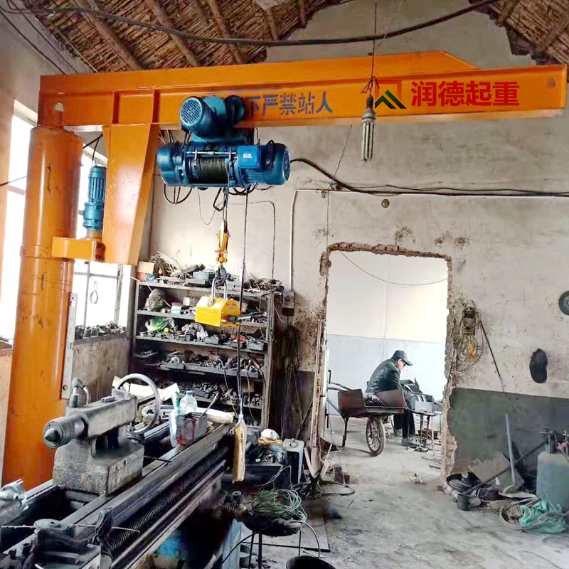 定柱式旋臂起重机配合了可靠性高的JPKK型环链电动葫芦尤其适用于短距离,使用频繁,密集性吊运作业,具有高效、节能、省事、占地面积小,易于操作与维修等特点。环链电动葫芦有起升和在横梁上往返运行的功能,旋臂梁可由回转装置上的的减速机带动滚轮进行回转运动,电器控制箱安装在环链葫芦上。
